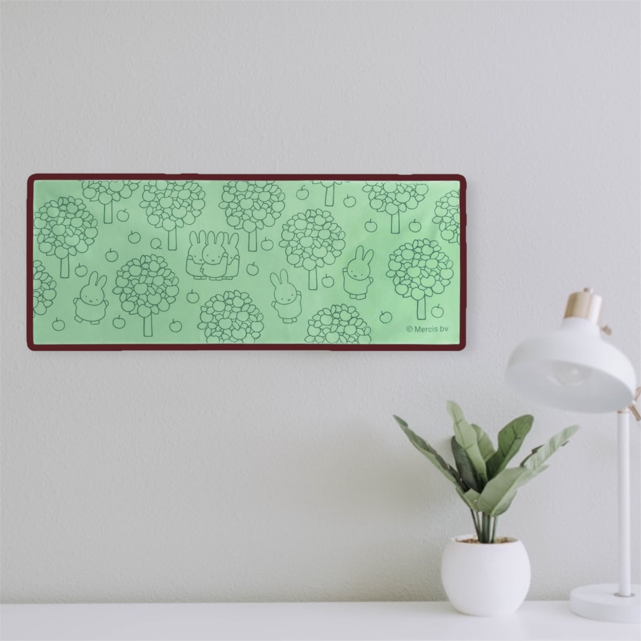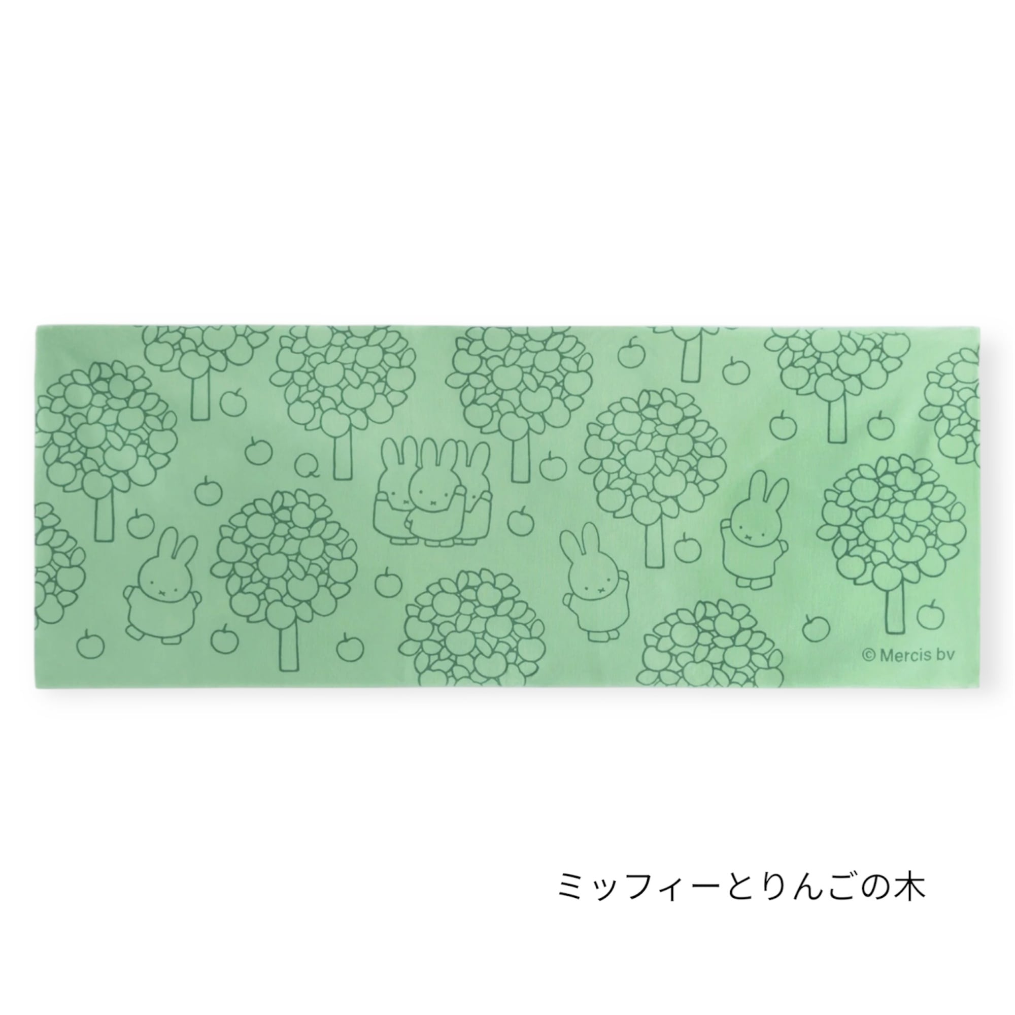 りんごの木々のまわりで集まって遊んでいるミッフィーたち。ピクニックやアウトドアシーンでお弁当包みやちょっとしたレジャーシート代わりに。また、カフェカーテンや棚の目隠しなど、インテリアとしても使いやすいデザインです
