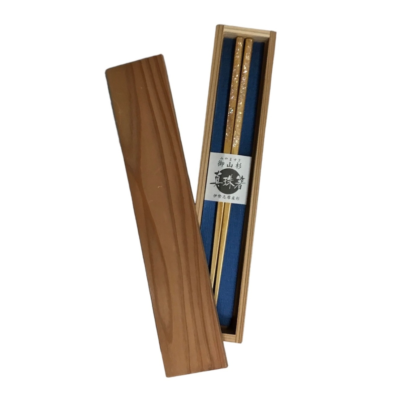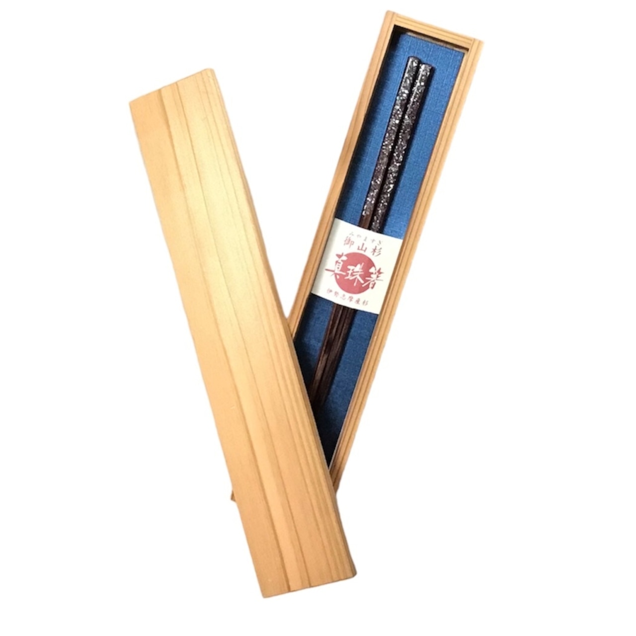 御山杉「真珠箸」は、真珠貝の真珠層をちりばめた塗り箸です。