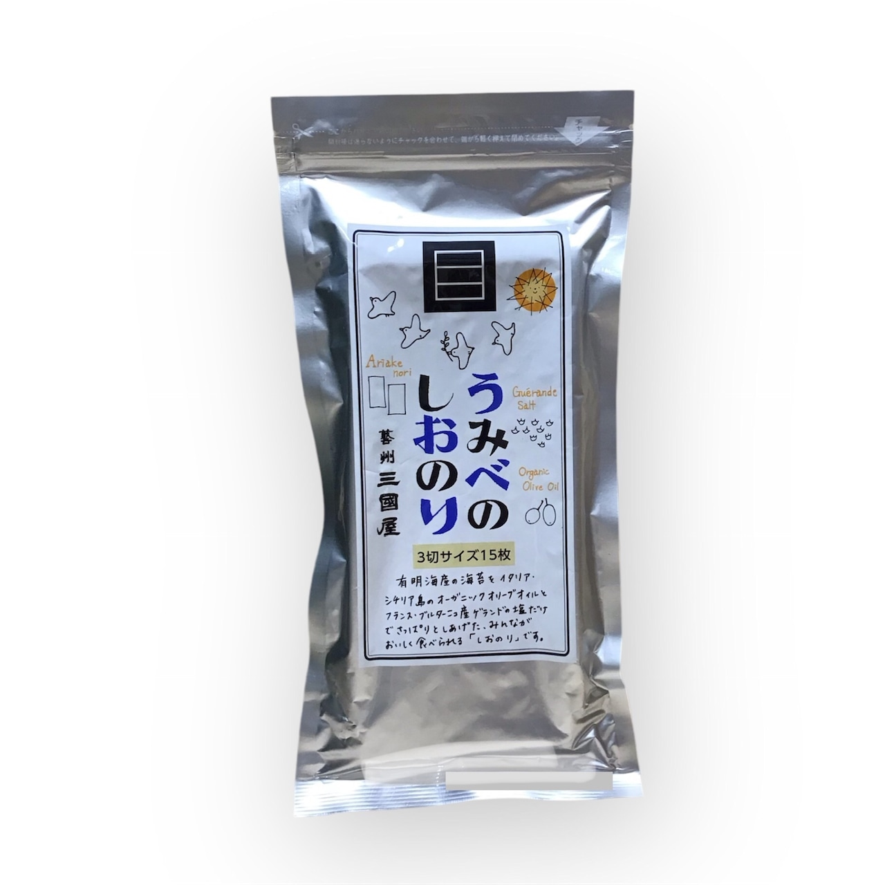 有明海産の海苔をイタリア産オーガニックオリーブオイルとフランスブルターニュ産ゲランドの塩でさっぱり仕上げた、みんなが美味しく食べられる三國屋自慢の「しおのり」です。