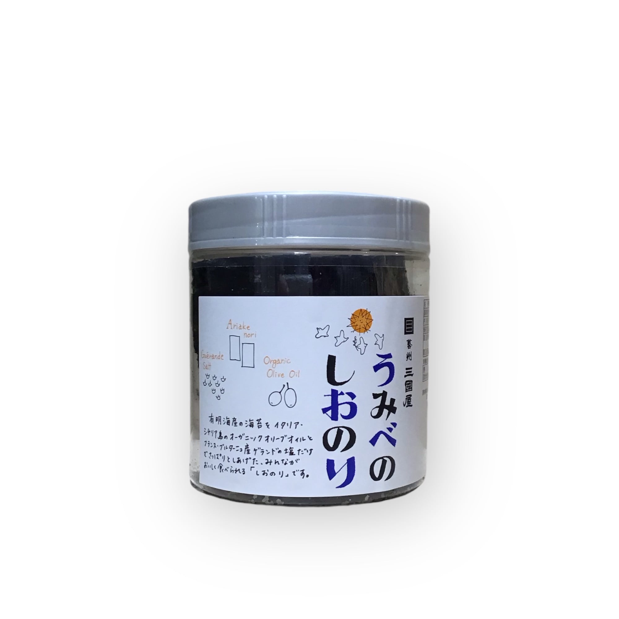 有明海産の海苔をイタリア産オーガニックオリーブオイルとフランスブルターニュ産ゲランドの塩でさっぱり仕上げた、みんなが美味しく食べられる三國屋自慢の「しおのり」です。
