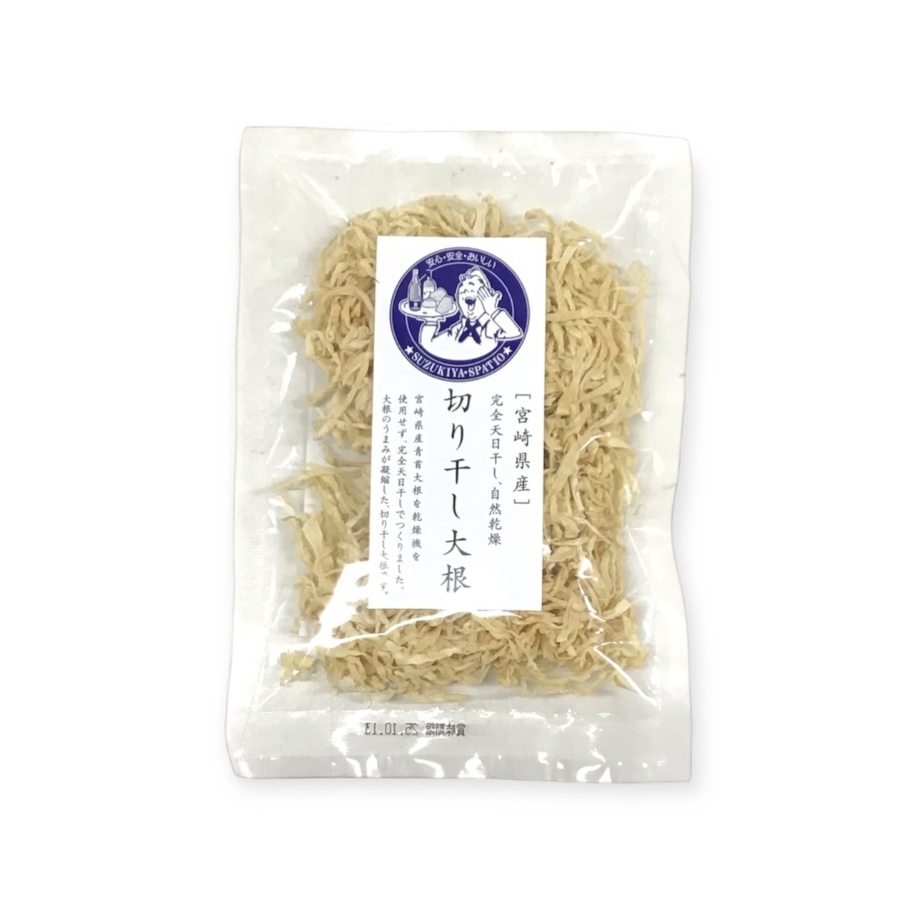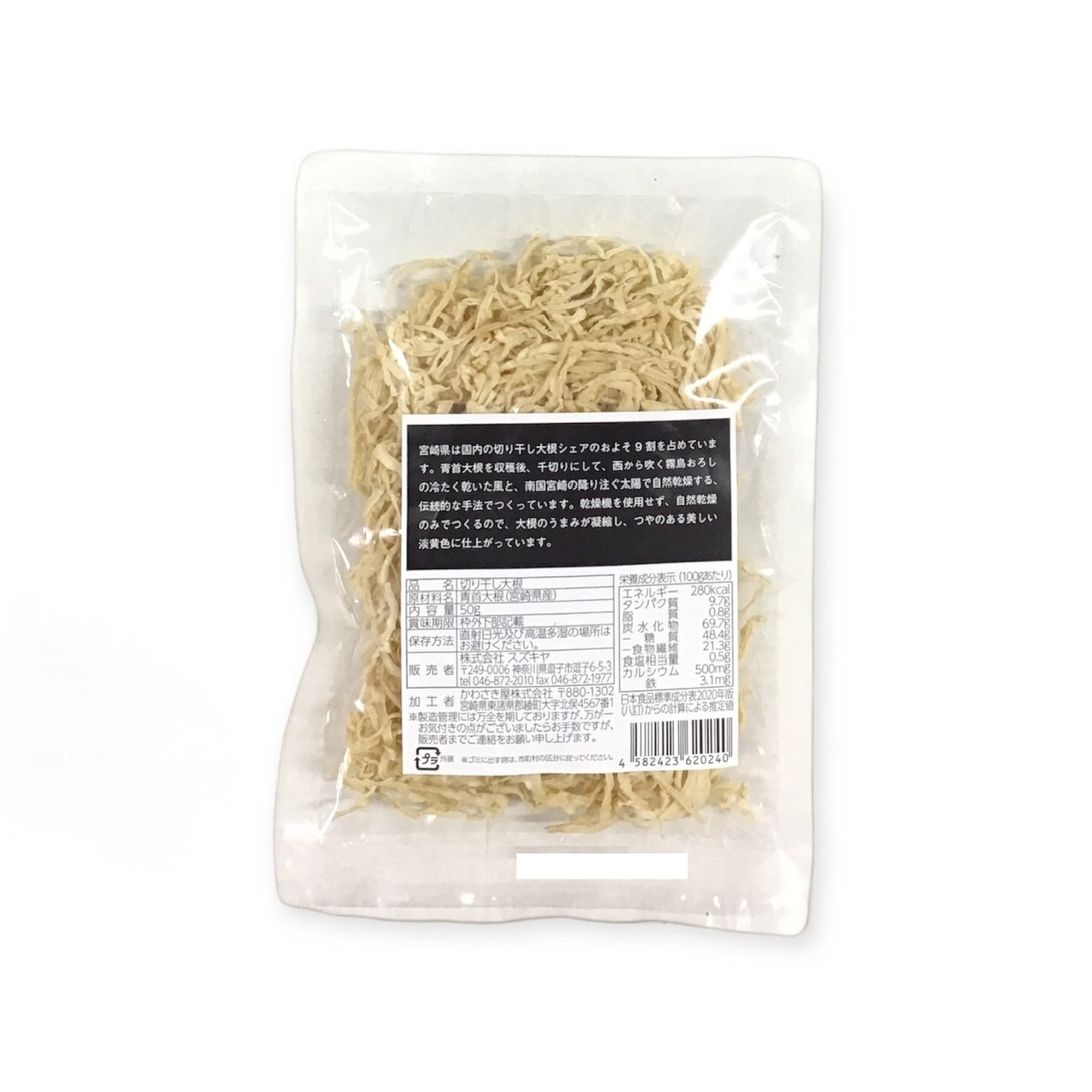 青首大根を収穫後、千切りにして西から吹く霧島おろしの冷たく乾いた風と南国宮崎の降り注ぐ太陽で自然乾燥する伝統的な手法で作っています。乾燥機を使用せず、自然乾燥のみで作るので大根の旨みが凝縮し、つやのある美しい淡黄色に仕上がっています。